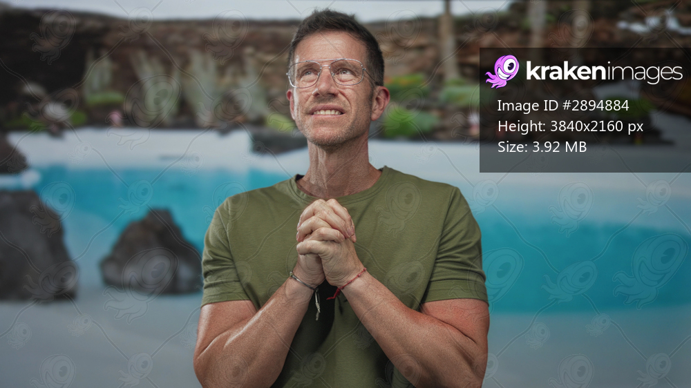 Man with clasped hands and visible forearms wearing green shirt and clear glasses in studio pool scene at resort hotel; calm reflection.