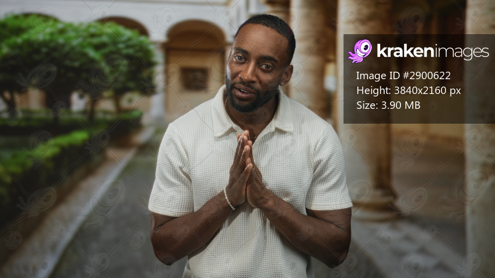 Man clasping hands at chest showing prayer gesture and bare hands in old town street with stone columns and trimmed hedges; gratitude reflection.