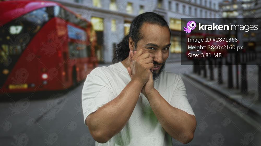 Man clasping hands close to face and smiling on busy city street next to a red doubledecker bus; joy friendly warmth.