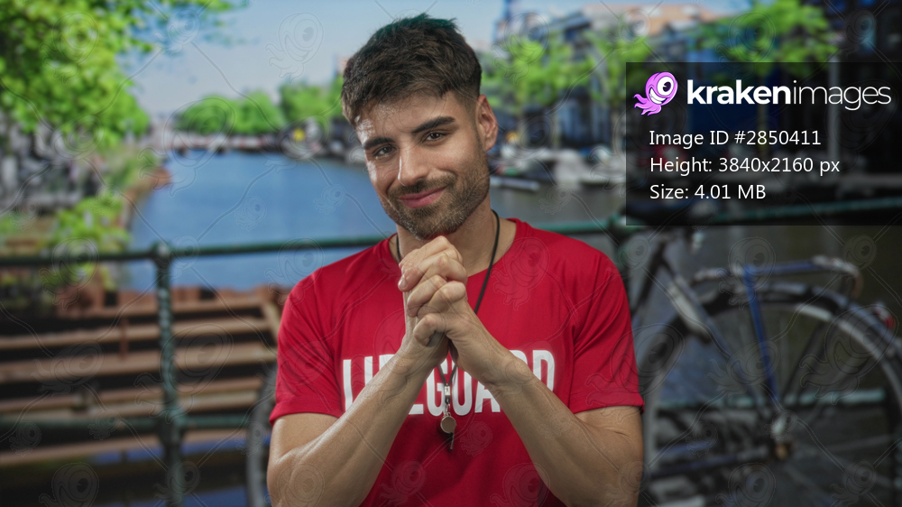 Man clasping hands near chest in red lifeguard shirt on street by canal with bicycle rack and riverside buildings; serenity.