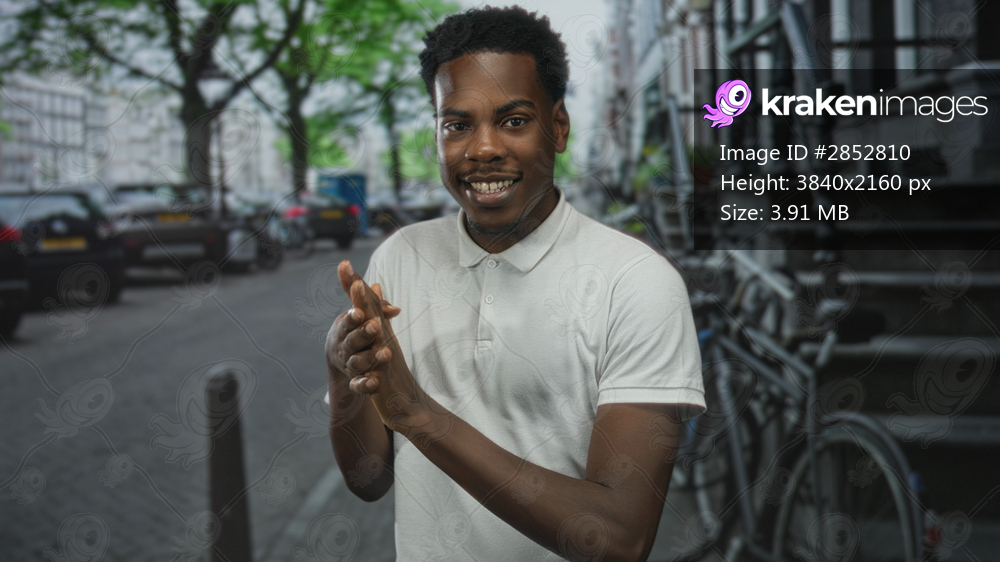 Man clasping hands on city street between parked cars and bicycle parked by building facade; confidence.