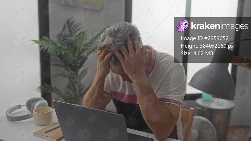 Man clasping hands over face at laptop on a cluttered desk with mug, headphones and lamp in studio; stress exhaustion.