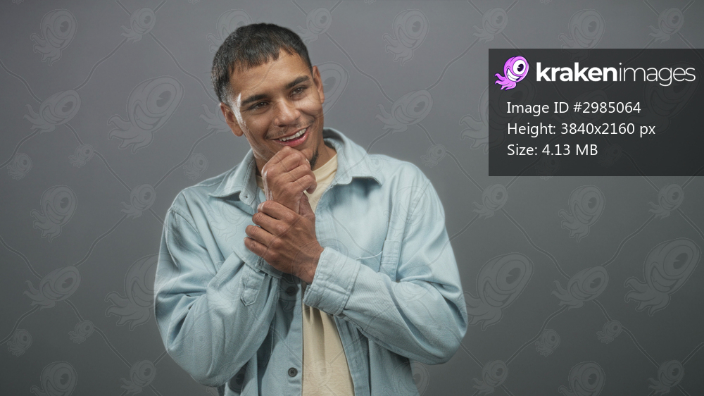 Man clasping hands and smiling in studio, wearing light blue denim shirt with visible hands and relaxed pose; happiness casual warmth.