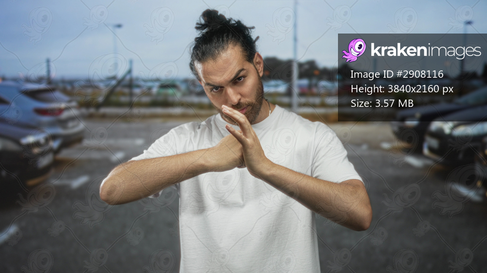 Man clasping hands with tense gesture in a street parking lot beside cars wearing white shirt, intense stare toward camera; urban defiance.