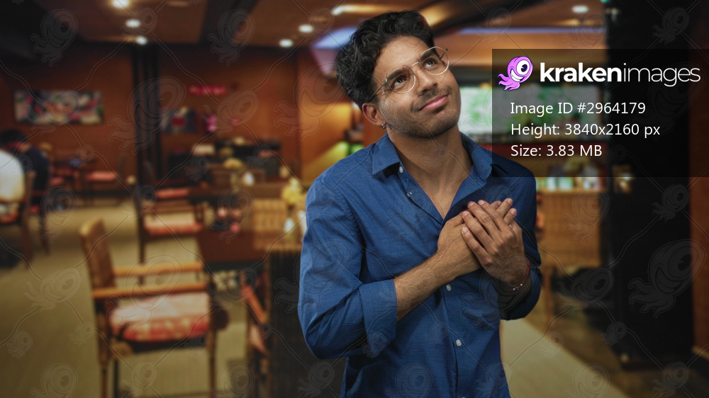 Man clasping hands to chest, smiling with eyes closed, wearing blue shirt and glasses inside a building cafe; gratitude warmth.