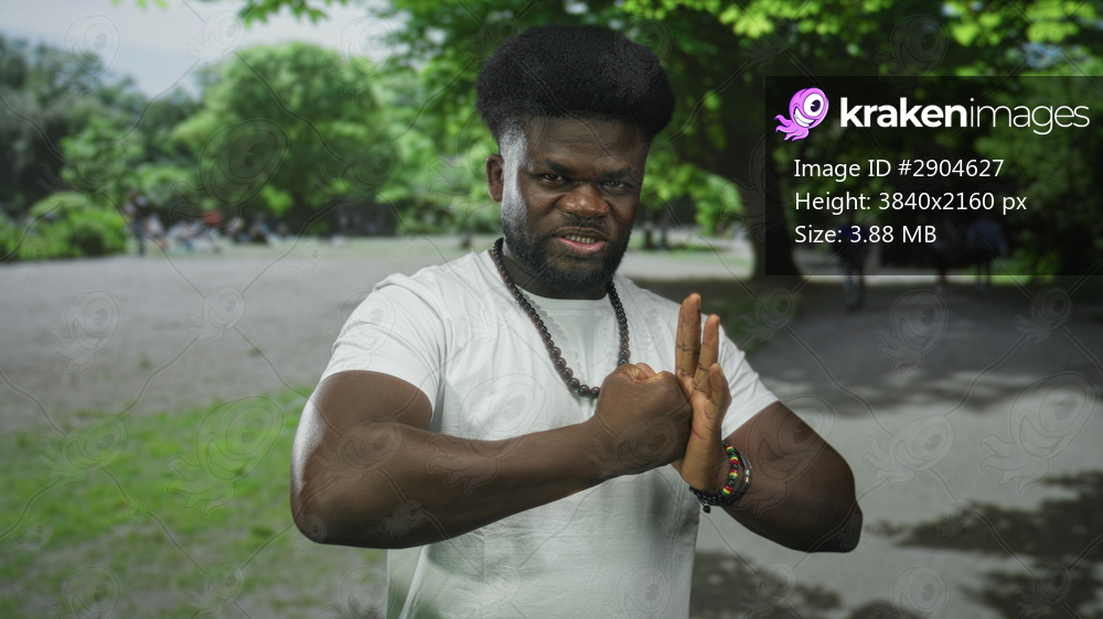 Man with clenched fist and open palm gesture in forest wearing white t shirt and beaded necklace, tense grimace and muscular arms; self defense anger.