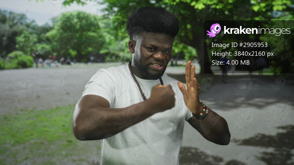 Man with clenched fist and open palm gesture in forest wearing white t shirt and beaded necklace, tense grimace and muscular arms; self defense anger.