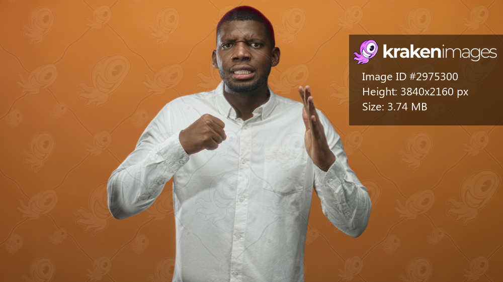 Man with clenched fist and raised palm performing punching motion in studio wearing white shirt with tense facial expression; anger resolve.