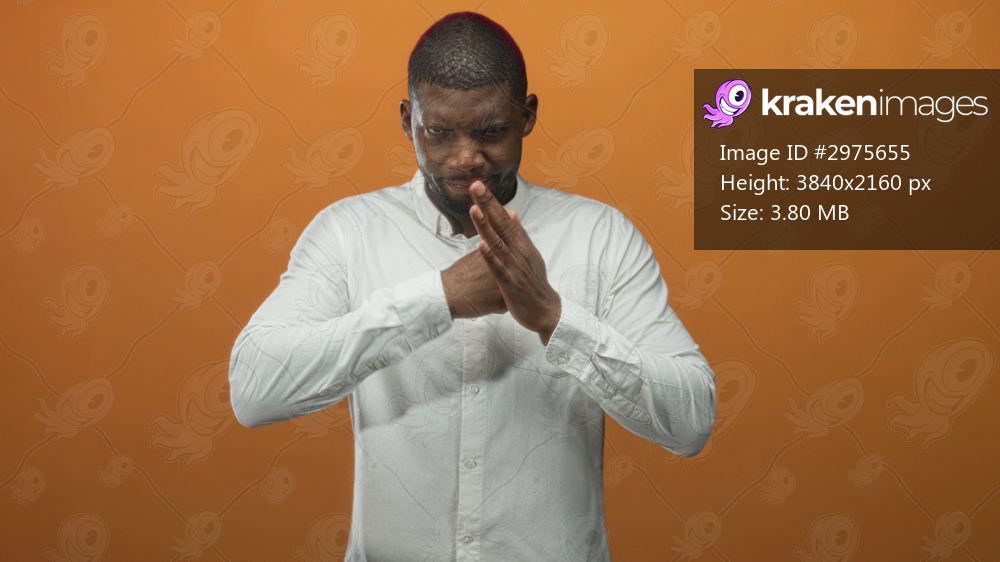 Man with clenched fist and raised palm performing punching motion in studio wearing white shirt with tense facial expression; anger resolve.