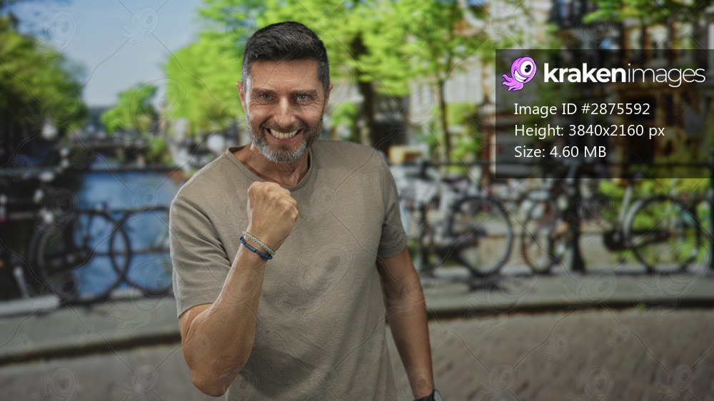 Man with clenched fist smiling on a city street by an amsterdam canal and parked bicycles; confidence success.