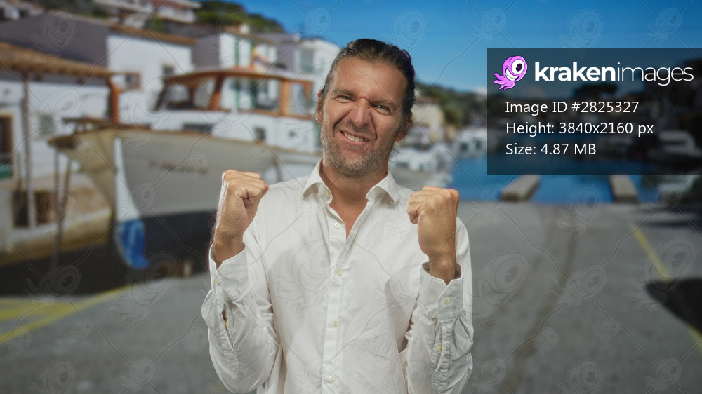 Man with clenched fists celebrating beside docked boats on a street lined with buildings; triumph excitement.