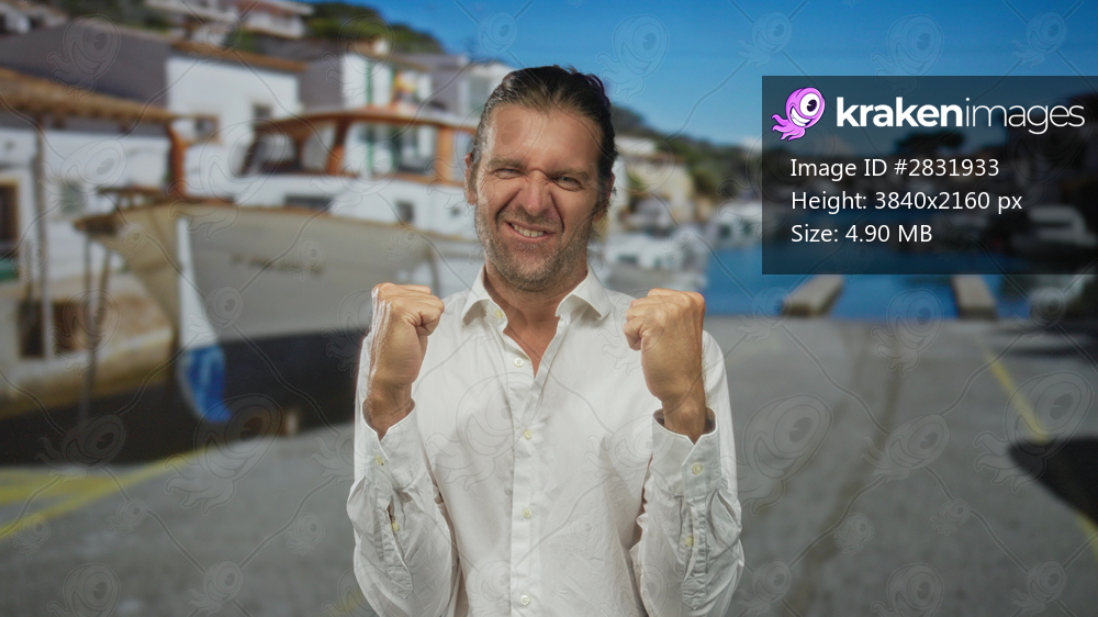 Man with clenched fists celebrating beside docked boats on a street lined with buildings; triumph excitement.