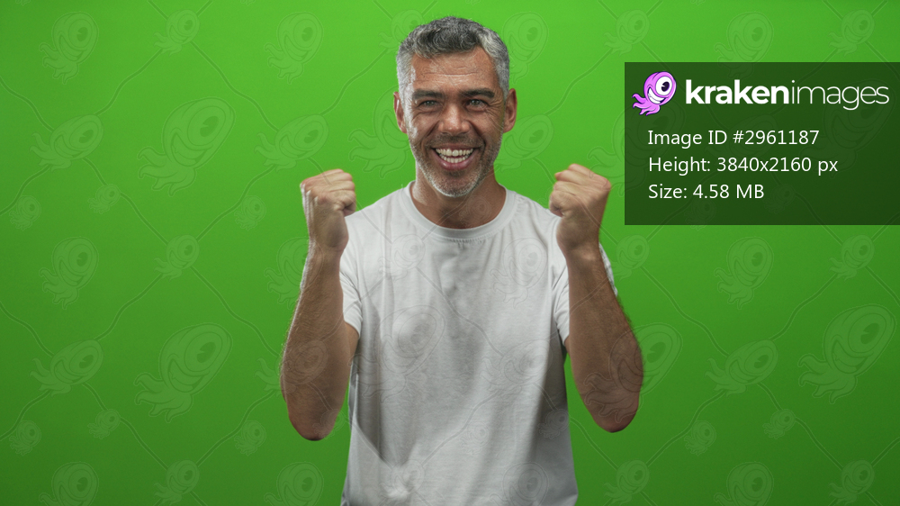 Man with clenched fists cheering on a studio green screen in a white tshirt, eyes closed and smiling; victory joy.