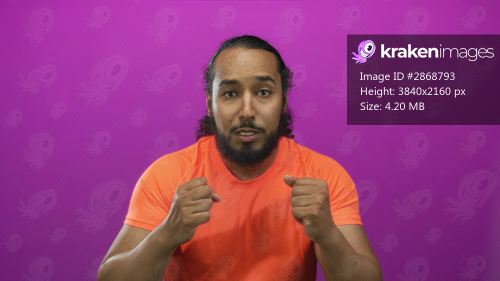 Man with clenched fists in a boxing stance in studio against purple wall; determination resilience focus.
