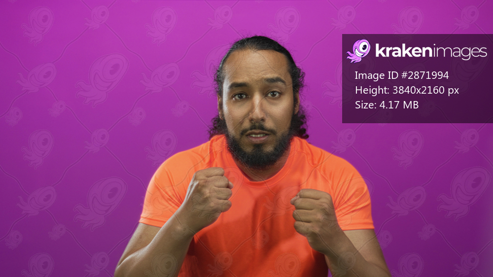 Man with clenched fists in a boxing stance in studio against purple wall; determination resilience focus.