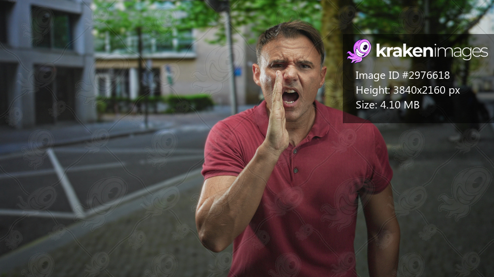 Man with clenched fists shouting in a red polo on a city street, turning his head and making a grimace; frustration determination resolve.