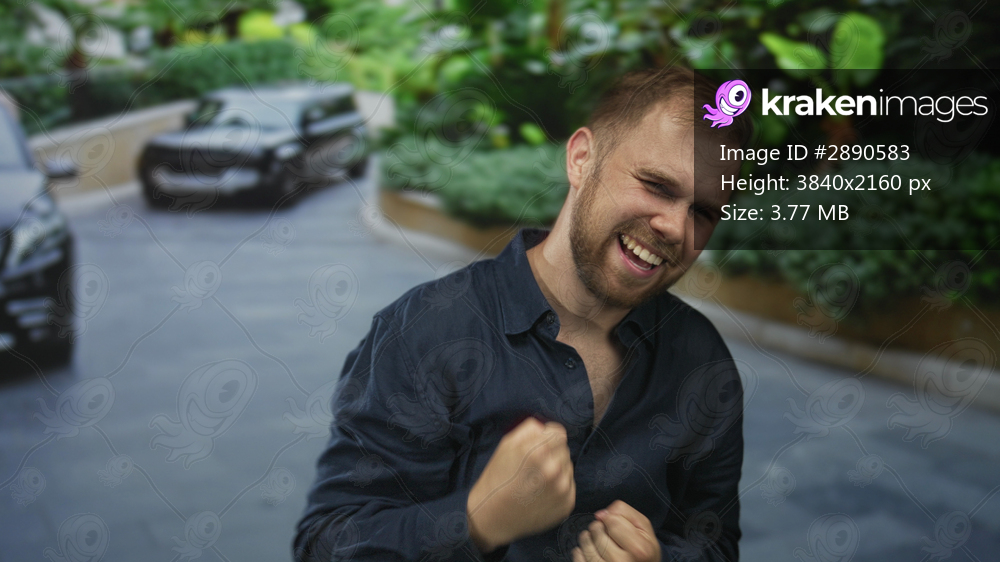 Man with clenched fists and smiling face on urban street beside parked cars and green shrubs wearing open shirt; triumph.