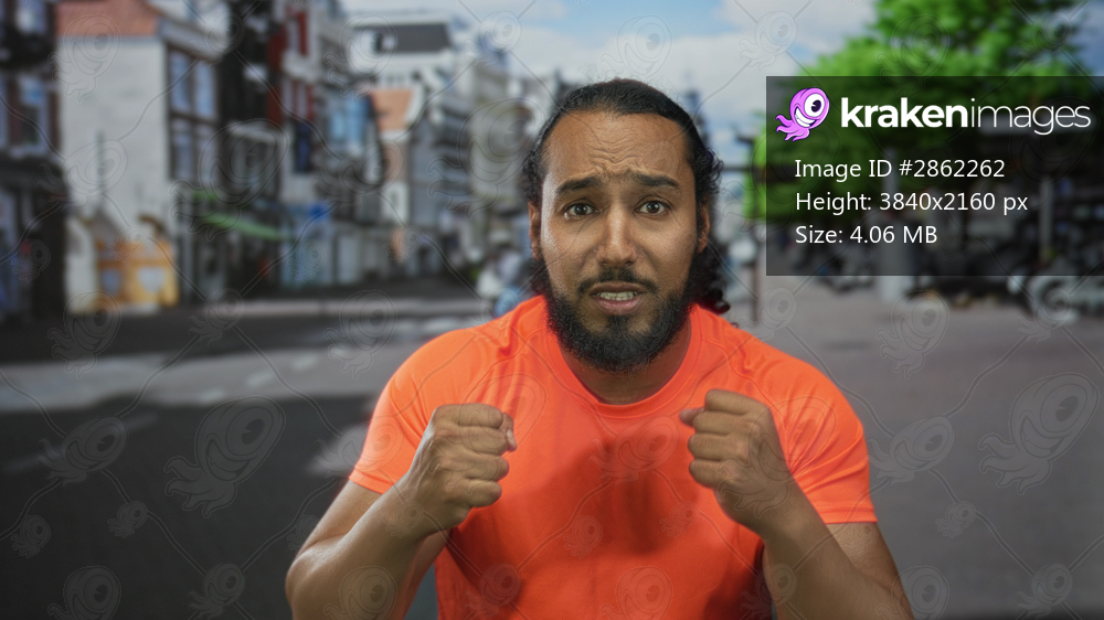 Man with clenched fists and tense face on street wearing orange tshirt, facing camera amid urban buildings and parked bicycles and motorcycles; concern. - Kraken Images