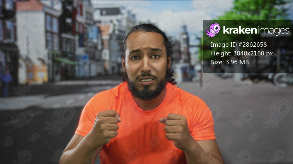 Man with clenched fists and tense face on street wearing orange tshirt, facing camera amid urban buildings and parked bicycles and motorcycles; concern. - Kraken Images