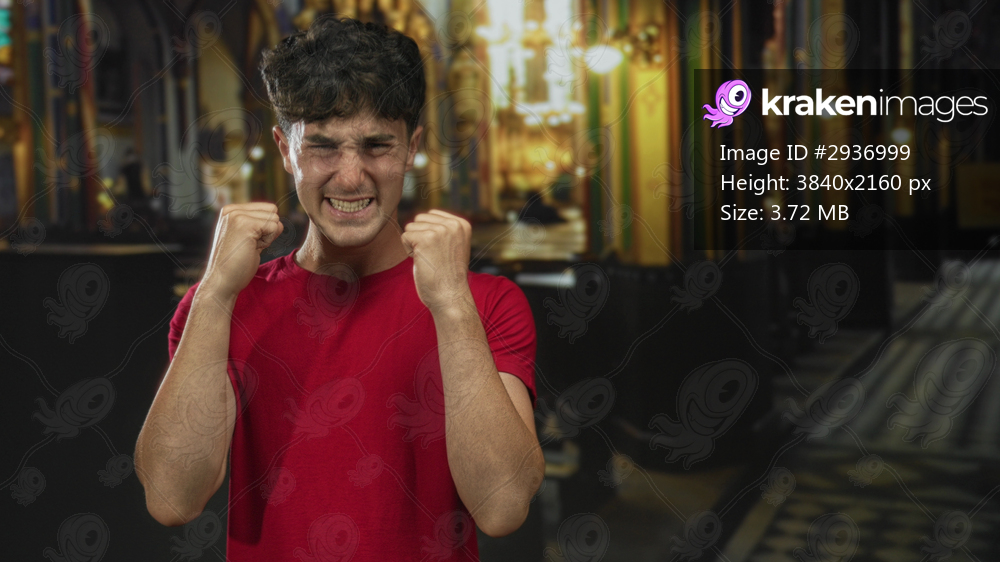 Man with clenched fists and visible forearms standing in church building; faith determination resilience hope.