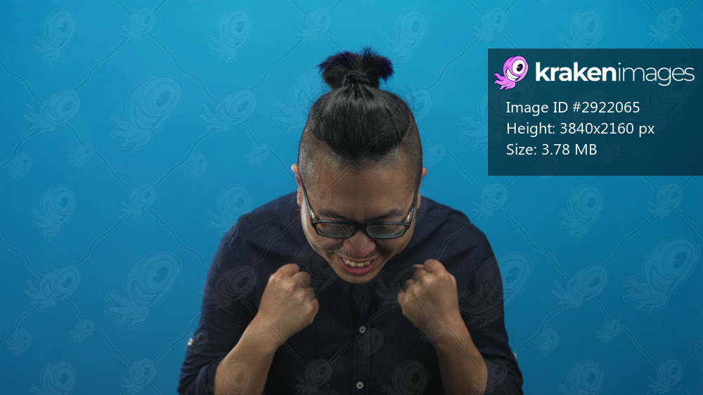 Man with clenched fists and visible hands smiling toward camera in blue studio wearing glasses and a dark button shirt; triumph joy.