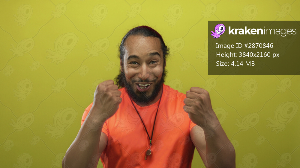 Man with clenched fists and whistle pendant facing camera in studio with lime green backdrop; victory motivation.