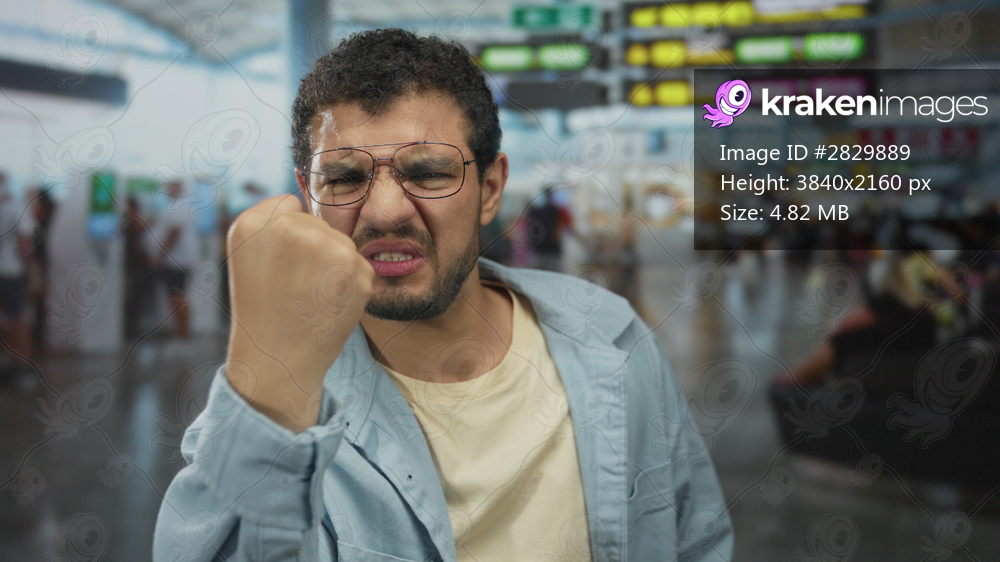 Man clenches fist with a grimace in a busy airport terminal under departure boards beside ticket kiosks; frustration.