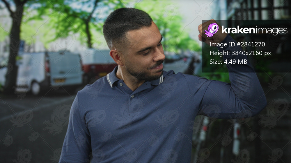 Man clenches fist with flexed bicep in front of white van on a shaded city street; triumph confidence.