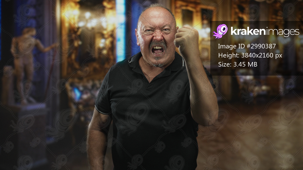 Man clenches fist, grimacing with teeth bared and raised knuckles, standing before gilt frames and marble statues in ornate building; anger defiance.