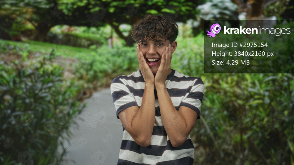 Man clenches fists near chest with closed eyes and wide grin, wearing a striped t shirt on a park path flanked by green hedges and trees; youthful joy. - Kraken Images