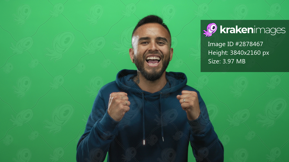 Man clenches fists and smiles at camera in green studio, navy hoodie, visible neck tattoo and beard; celebration joy.