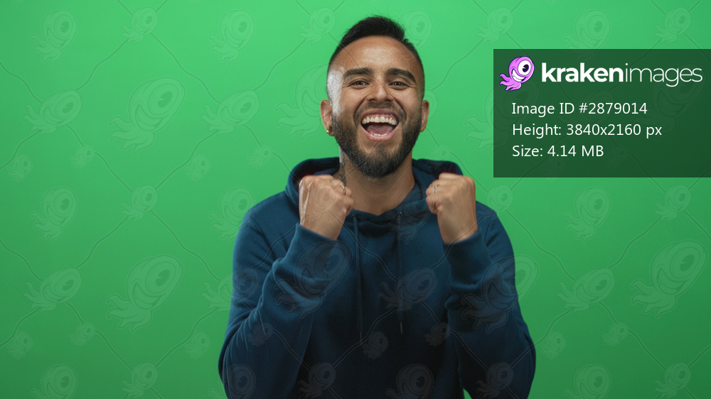 Man clenches fists and smiles at camera in green studio, navy hoodie, visible neck tattoo and beard; celebration joy.