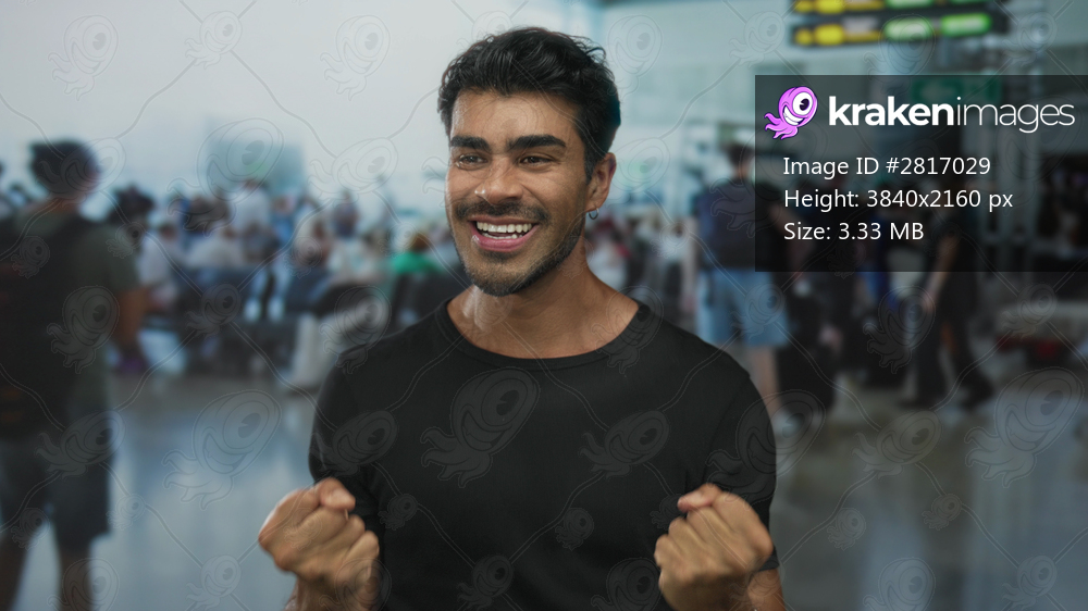 Man clenches fists and smiles with excitement in crowded airport terminal; victory celebration achievement excitement.