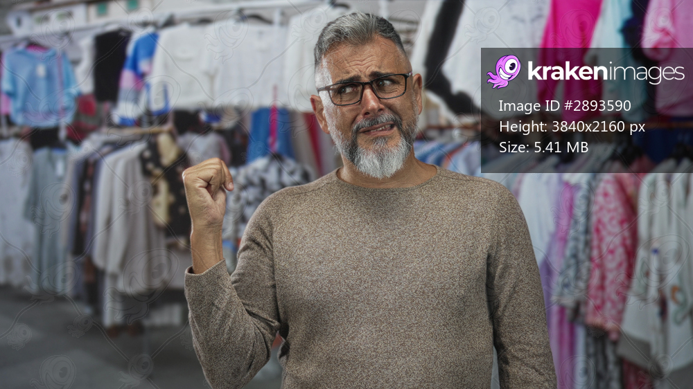 Man clenching fist at street market beside crowded clothing racks and souvenir stalls; frustration shopping stress.
