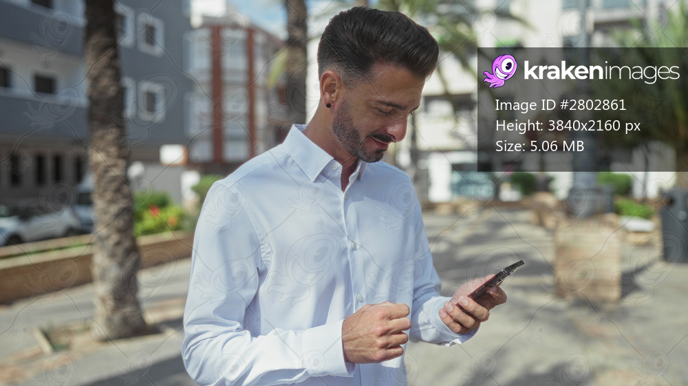 Man clenching fist while holding smartphone on busy street lined with tall palm trees and sunlit benches; celebration.
