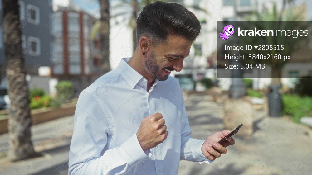 Man clenching fist while holding smartphone on busy street lined with tall palm trees and sunlit benches; celebration.