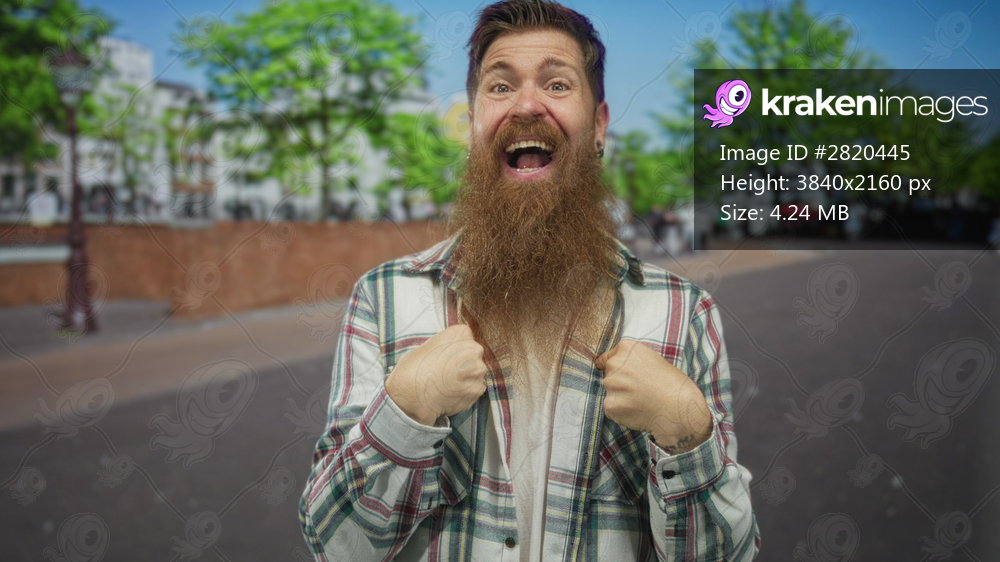 Man clenching fists in busy city street wearing plaid shirt and sporting long beard with intense gaze; determination.