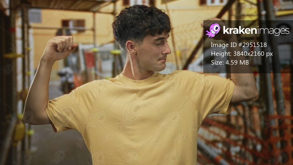 Man clenching fists and smiling in front of scaffolding on a building walkway at an outdoor construction area; determination.