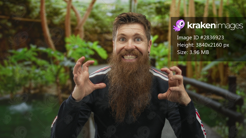 Man clenching fists and smiling on wooden bridge in a lush green park under bright sunlight; excitement.