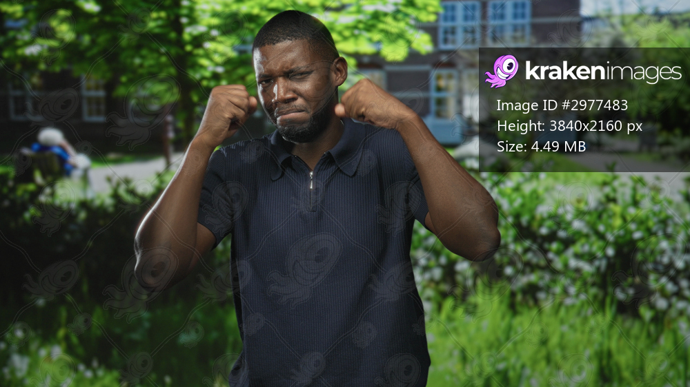 Man clenching fists and wincing with bare forearms visible, standing on grass in front of a building; frustration.