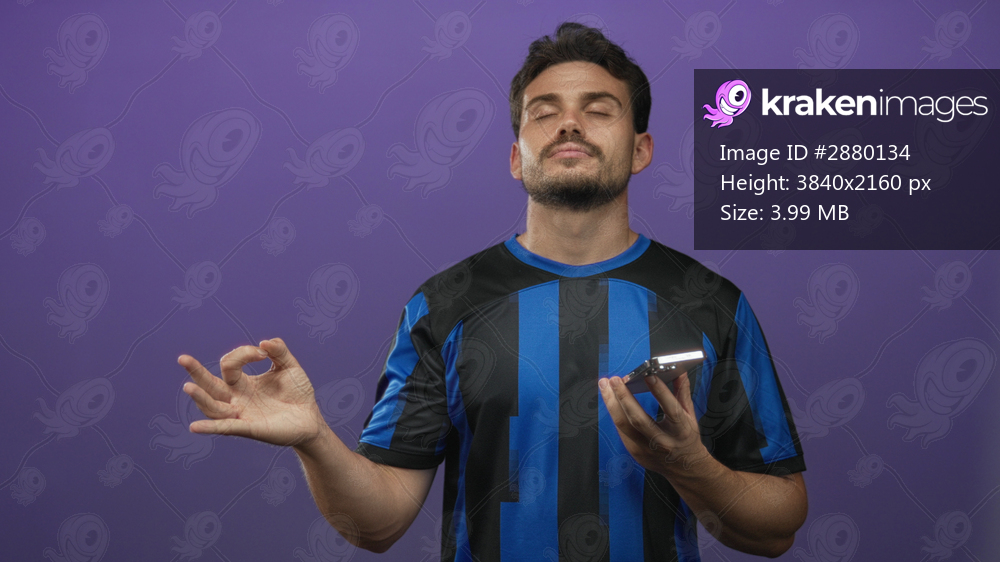 Man with closed eyes holding smartphone and making ok sign while wearing blue black striped shirt in purple studio; calm meditation focus.