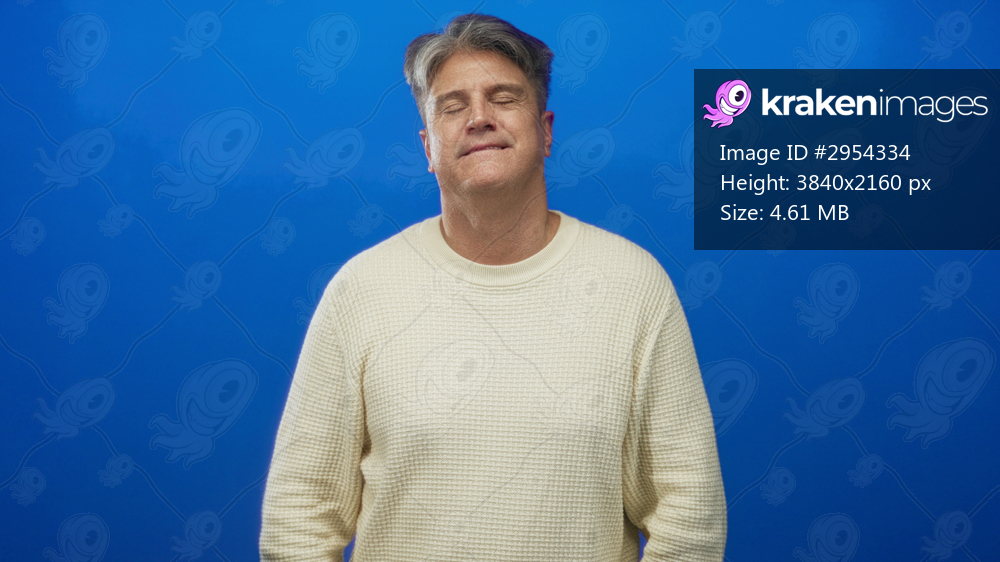 Man with closed eyes and slight smile stands facing camera in studio against vivid blue backdrop wearing cream sweater; calm reflection.