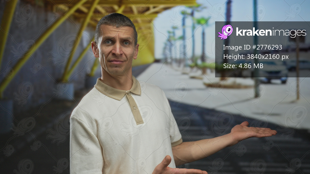 Man with closed eyes stands outdoors beside modern street structure with yellow beams and palm trees lining the sidewalk in bright daylight.