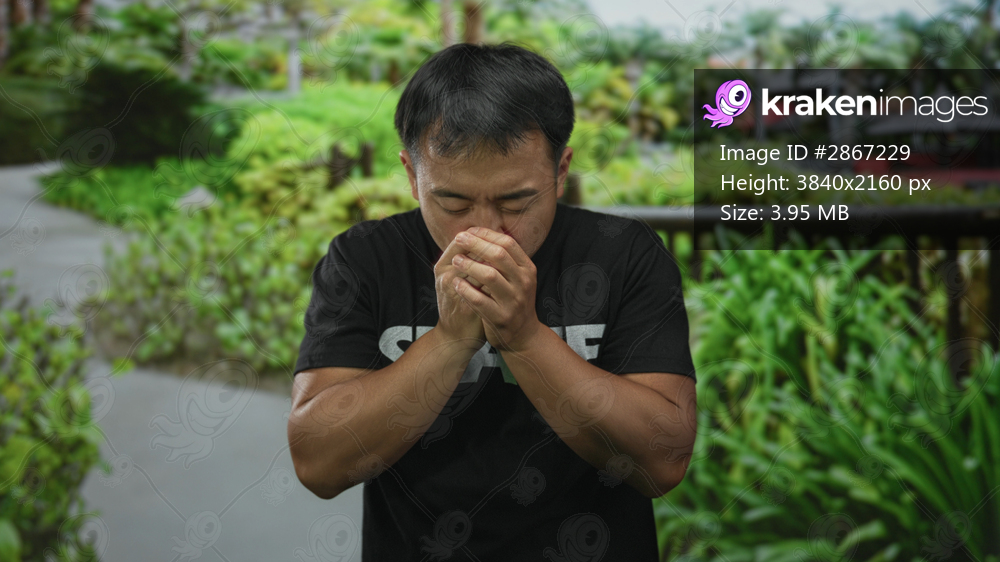 Man clutch chest for heartattack while standing in green forest pathway surrounded by lush foliage; health danger distress.