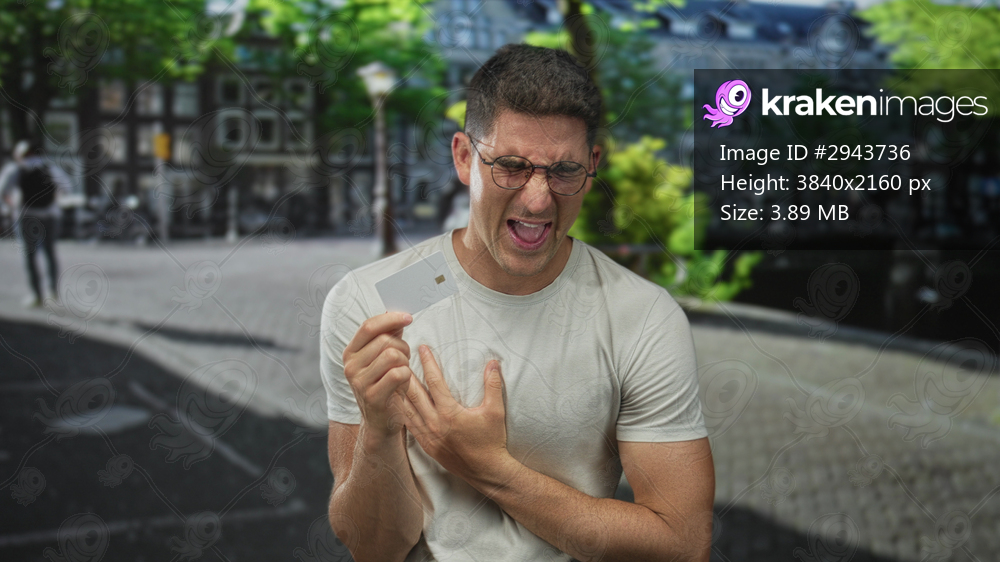 Man clutch chest holding white creditcard with chip on city street during heartattack; panic emergency.