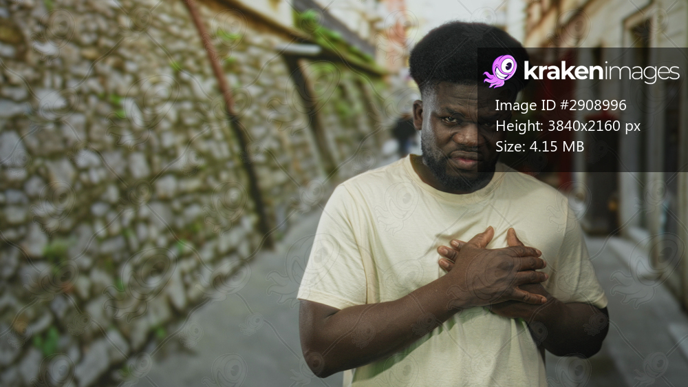 Man clutch chest on street with hands over heart and tense expression, suggesting heartattack pain; pain vulnerability.