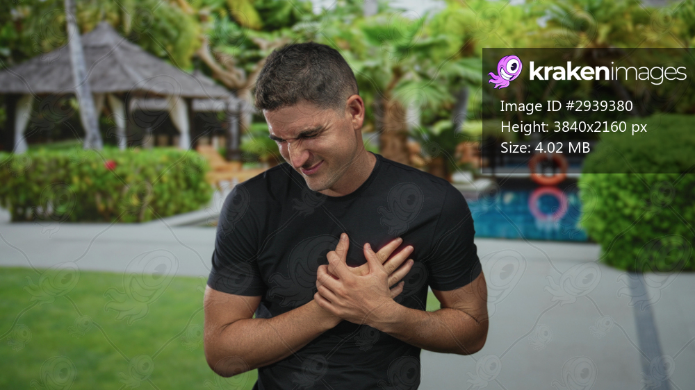 Man clutches chest for heartattack at resort pool building, hands over sternum and grimacing; acute pain.