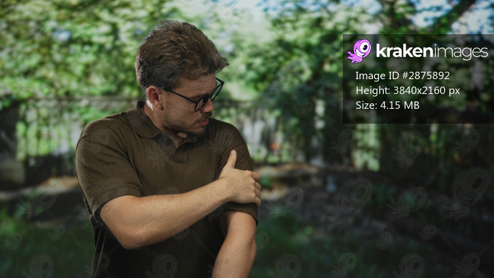 Man clutching bare shoulder and grimacing while wearing glasses and a brown polo shirt in a forest park setting; pain recovery.