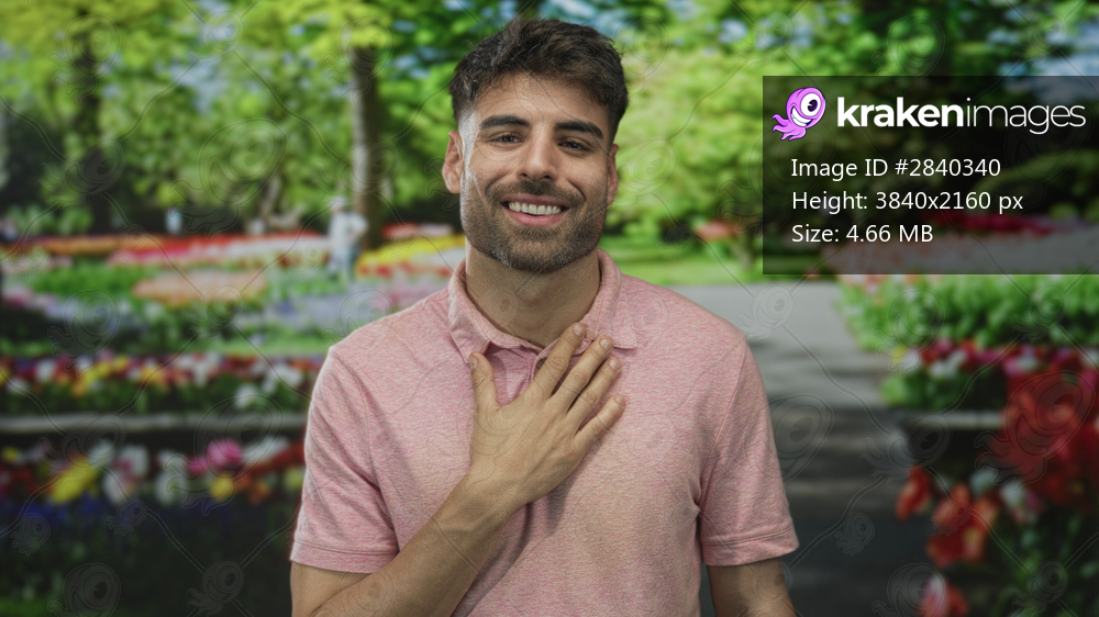 Man clutching chest among blooming flowers under dense green foliage in forest; calm reflection sincerity gratitude.