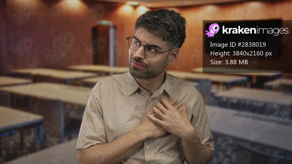 Man clutching chest at wooden desk amid rows of desks in bright classroom indoors; anxiety worry concern tension.